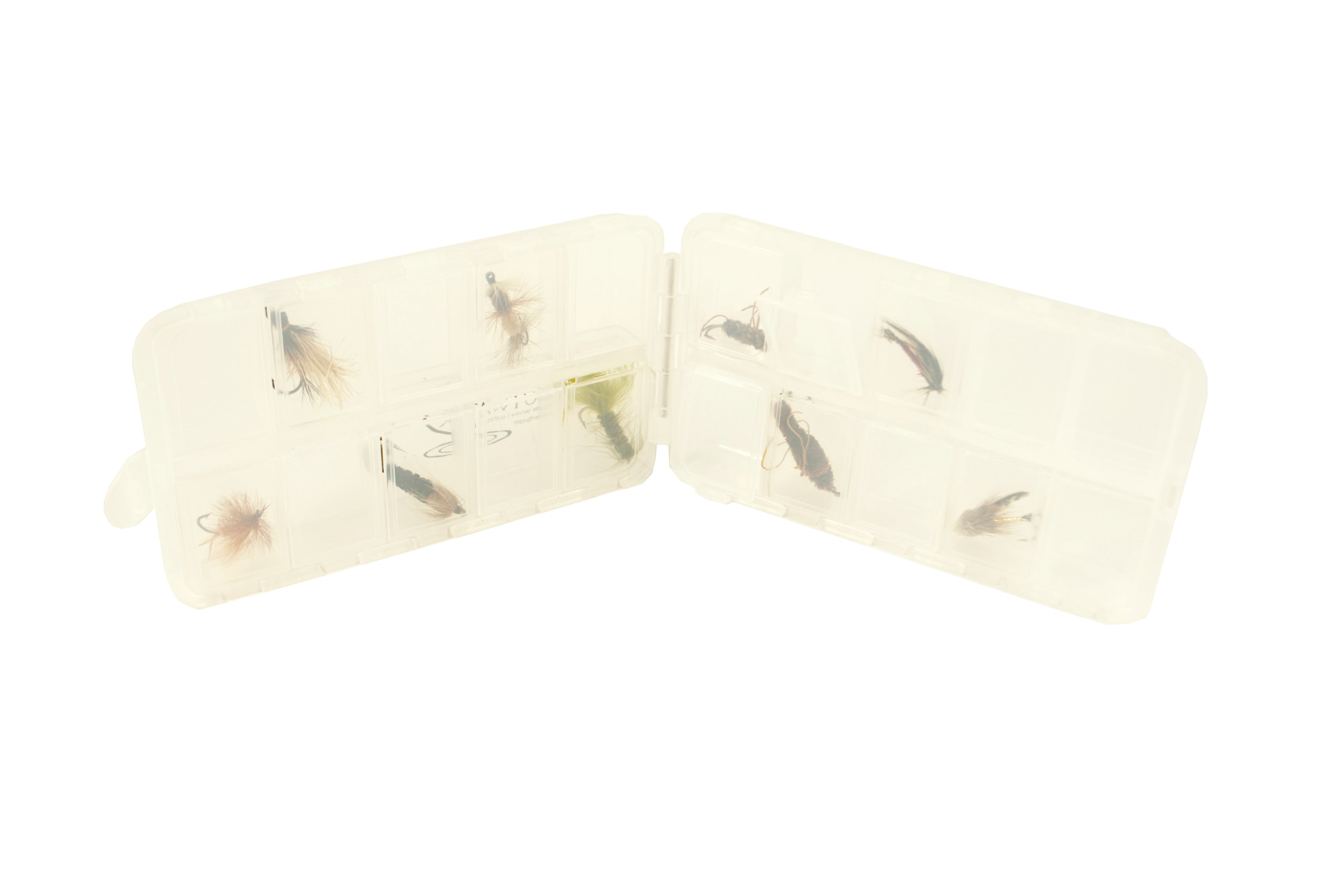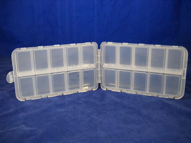 Twenty compartments, snap tight latch, tuff clarified polypropylene, has handy hang tab, and a living hinge. Includes imprinting.